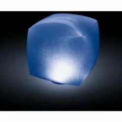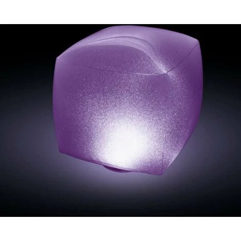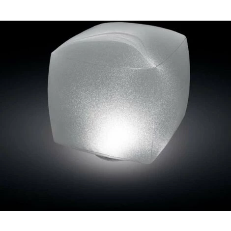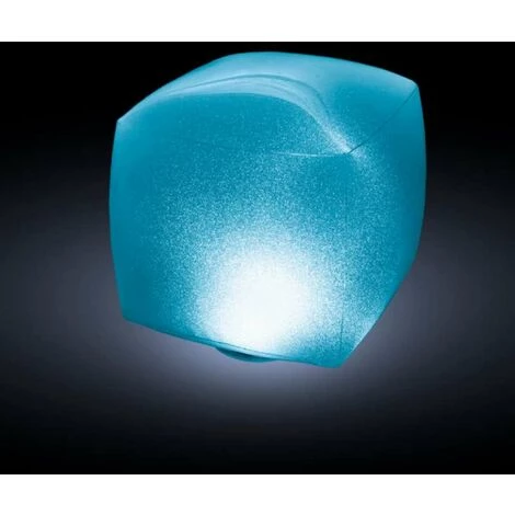Informations produit: Cube flottant Intex pour piscine Éclairage Led Matière: PVC Alimentation: 3 piles AAA Non fournies Dimensions: 23 x 23 x 22 cm Allumage par capteur tactile Extinction: auto toutes les 2 heures pour éviter usure des piles