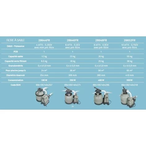 FILTRE À SABLE 28646FR.Débit – Puissance : 6 m³/h – 0,3CV.Capacité sable : 23 kg.Capacité verre filtrant : 16 kg.Granulométrie : 0,4 à 0,8 mm.Pour piscine jusqu’à 36 m3.Diamètre réservoir : 305 mm.Consommation : 250 W.