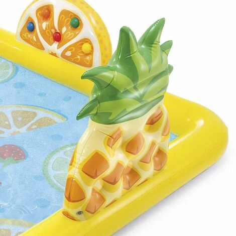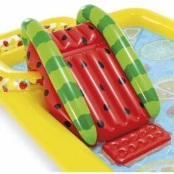 Glisse sur le toboggan et atterris dans la piscine grâce la super aire de jeux gonflable Multifruits d’Intex qui rendra l’été dans le jardin inoubliable !