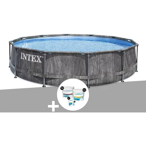 Piscine tubulaire Baltik ronde 5,49 x 1,22 m – Intex. Liner en PVC armé triple épaisseur avec effet bois inspiré des tendances scandinaves.Accessoires inclus :