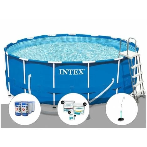 Kit Piscine Tubulaire Intex Metal Frame Ronde 4,57 X 1,22 M + 6 Cartouches De Filtration + Kit De Traitement Au Chlore + Douche Solaire – Bleu