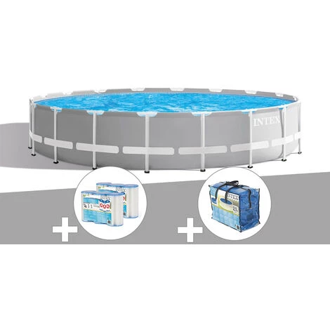 Piscine tubulaire Prism Frame ronde 5,49 x 1,22 m – Intex. Liner en PVC armé triple épaisseur gris clair.Accessoires inclus :