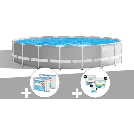 Piscine tubulaire Prism Frame ronde 5,49 x 1,22 m – Intex. Liner en PVC armé triple épaisseur gris clair.Accessoires inclus :