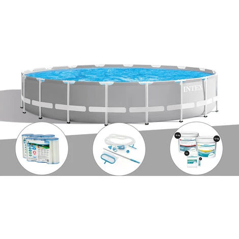 Kit Piscine Tubulaire Intex Prism Frame Ronde 6,10 X 1,32 M + 6 Cartouches De Filtration + Kit D’entretien + Kit De Traitement Au Chlore – Gris