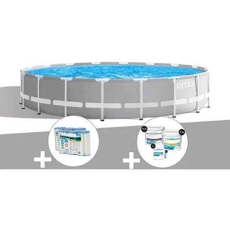 Piscine tubulaire Prism Frame ronde 6,10 x 1,22 m – Intex. Liner en PVC armé triple épaisseur gris clair.Accessoires inclus :