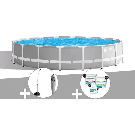 Kit Piscine Tubulaire Intex Prism Frame Ronde 6,10 X 1,32 M + Douche Solaire + Kit De Traitement Au Chlore – Gris