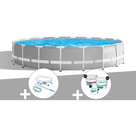 Kit Piscine Tubulaire Intex Prism Frame Ronde 6,10 X 1,32 M + Kit D’entretien + Kit De Traitement Au Chlore – Gris