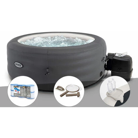 Kit Spa Gonflable Intex PureSpa Access Rond Bulles 4 Places + 6 Filtres + Kit D’entretien + Porte-verre – Gris