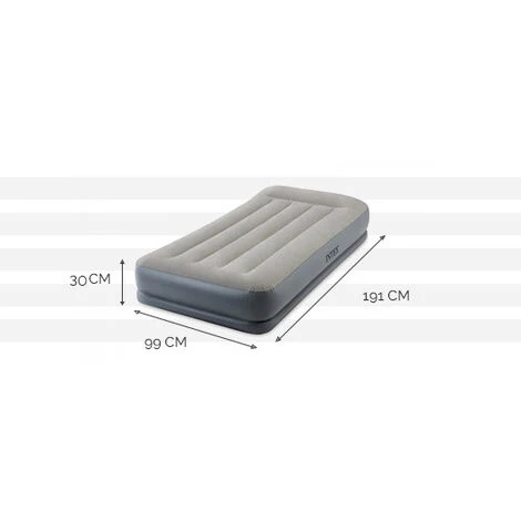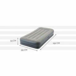 Lits gonflables Mid Rise• Accueil : tonique / Soutien : équilibré• Matelas + sommier en 1• Gonfleur électrique intégré (220V) : gonflage et dégonflage rapides (+/- 1 min 3/4) (possibilité de gonflage manuel)• Structure Fiber Tech : + solide, + léger,+ confortable• Composé de milliers de fibres : très solide, répartition du poids homogène, légèreté du matelas• Oreiller intégré• Fermeté réglable• Flocage sur le dessus : surface de couchage douce• Tour et fond en vinyle non floqué : facile à nettoyer• Matière : vinyle• Poids maximum supporté : 136 kg• Dimensions : (l) 99 x (L) 191 x (h) 30 cm• Poids : 4,6 kg