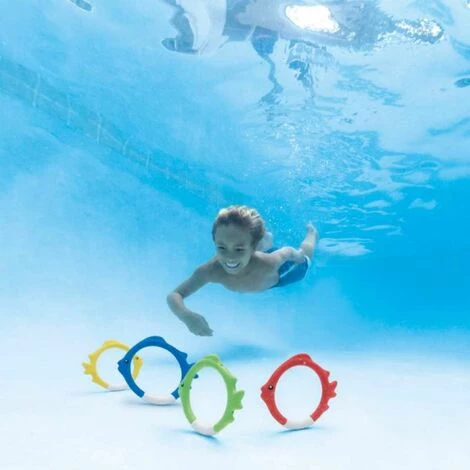Description détaillée du produit: produit: set de quatre anneaux poissons colorés pour piscine marque: Intex coloris: rouge, bleu, vert, jaune matière: plastique souple particularité: ne flotte pas, tient debout au fond de l’eau ce produit convient pour des enfants âgés de plus de 6 ans.
